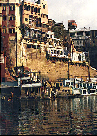 Glorious sunrise from the river, though, looking up at the city towering over the ghats, the multitudes of bathers at its feet, splashing, shivering, spitting out mouthfuls of water back into the Ganges; pigeons wheeling in the smoke over Manikarnika Ghat, above the pair of shirtless wood-splitters sledgehammering in metallic tandem, the huge black logs stacked on the steps and in the arches of the disused temple, the black ash carpeting the water and the bank, the shore disguised, the loitering of mourners near the flames, the discarded flowers and gold-threaded wrappings. . .Brahmins singing greetings to the sun from their blue puja platforms; the souvenir-sellers' skiffs stuck like lampreys to the big two-rower tourist group boats; the flat, hazy, pastel sketchiness of the further shore where there is nothing, only sand and strips of green and a few boats groundedthe view left empty of anything but water and skyno earth, just air. . .the view from one insanely crowded shore.