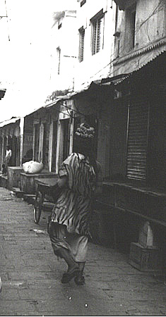 Tired of Indian laziness! Yesterday at Ram Nagar Fort, the maharaja's old palace, now (very partially) a "museum," appallingly dusty, appallingly filthythe ladies' toilet, beyond beliefeverywhere, occupying every shady spot big enough for stretching out in, there were men at rest. . .three, just inside the doorway to the arms and ivory collection, taking tickets (well, one taking tickets and two watching him) call out "Not to touch!" when I run my finger through the thick fur of dust on a gun stock steps away from where they sit; another raises demands for baksheesh after standing up to put on his turban and point through the missing panes of mirrored glass in a set of padlocked, decrepit, peeling doors to the former formal receiving room beyond: a vision of decay under crystal chandeliersgrey rotting silk walls, chairs, carpets; three tiger heads on one side of the floor, their skins gone, rotted or simply taken away and sold, face another, left intact, across the room. . .I scolded the three men in weapons and refused baksheesh to the jabbering turbaned old man, who was angry. . .grudgingly gave a little to the temple attendant at the shiva linga out back overlooking the river but cut off his attempts to "earn" more as an impromptu tour guide (the dramatic, sweeping arm gesture at the city on the distant other shore, completed by the thundering pronouncement: "Varanasi!" I said, Please, how could I be here and not know that was Varanasi?. . .), part of my process of discovering that brahmins are a problem hereany group of people not allowed to sweep or dust would be a problem in India and at Ram Nagar Fort they're nothing but a blightlike wormy parasites eating up their surroundings and hastening decayreclining, recumbent parasites.